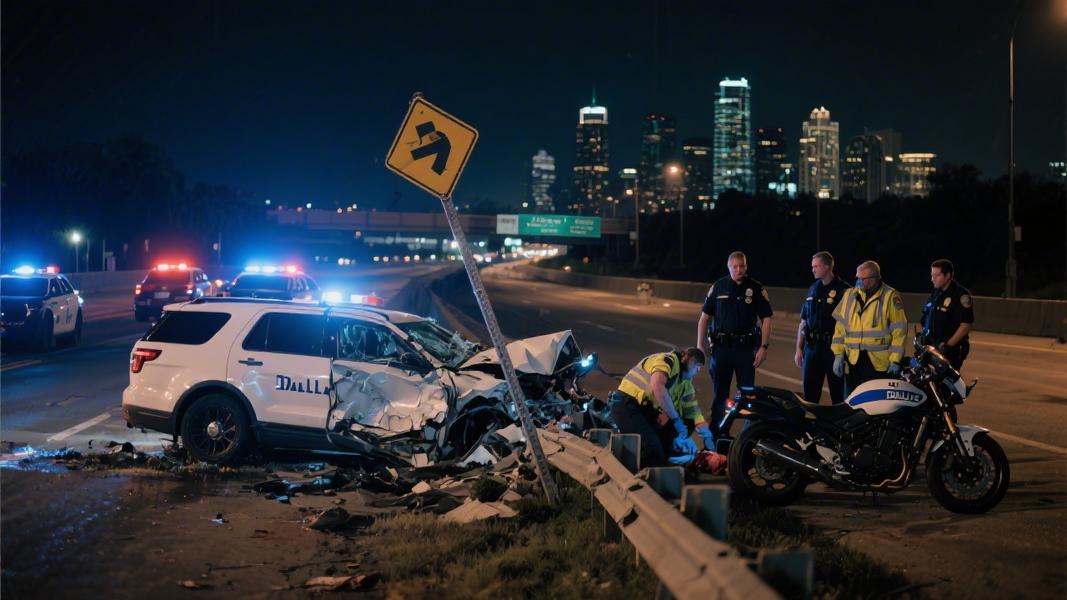 The incident unfolded around 12:45 a.m. Monday on Interstate 35E near Inwood Road on North Stemmons Freeway, when an unknown driver struck the officer’s motorcycle and immediately fled the scene. It’s the kind of crash that could have ended far worse — and very nearly did.