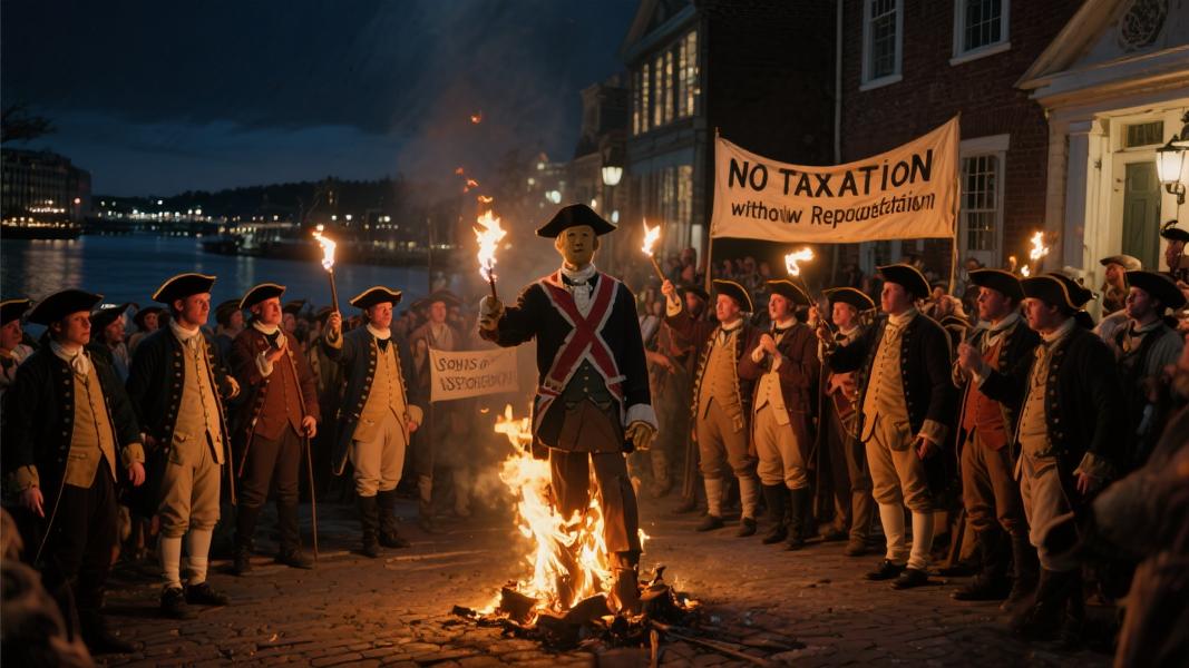 What began as whispered meetings soon erupted into public defiance. On August 14, 1765, the group orchestrated their first major action — a dramatic public protest against the hated Stamp Act. Under the cover of Boston’s “Liberty Tree,” the protesters hung an effigy of British tax collector Andrew Oliver, eventually burning it in a fiery demonstration of colonial anger. According to historical accounts, “the riotous, angry, and alcohol-fueled crowd paraded the effigy through the streets of Boston inciting supporters of the Patriot cause throughout the city. Soon mob rule was the order of the day, and the effigy was stomped-on, beheaded, and ultimately burned in a fit of anger.“